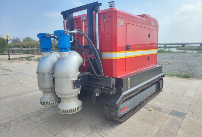 前端設(shè)計為雙吸水口,并配備遙控升降式結(jié)構(gòu),使其能在僅380毫米深的淺水區(qū)域高效作業(yè)。兩側(cè)裝有液壓驅(qū)動系統(tǒng),底部則為履帶式行走裝置,確保在泥濘地面行走時不會對路面造成損害。